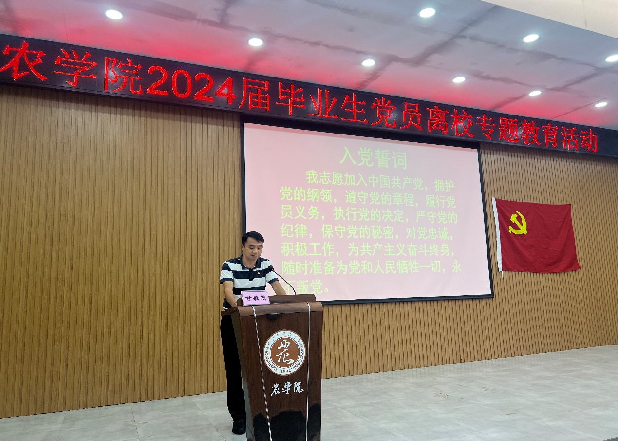 毕业生党员代表张文选在发言中表示,感恩母校的培养和教育,无论何时何地都要谨记共产党员的身份,不忘初心,牢记使命,在乡村振兴的伟大实践中,成为“一懂两爱”的新农人,努力为党、为人民工作,回报祖国和社会。
