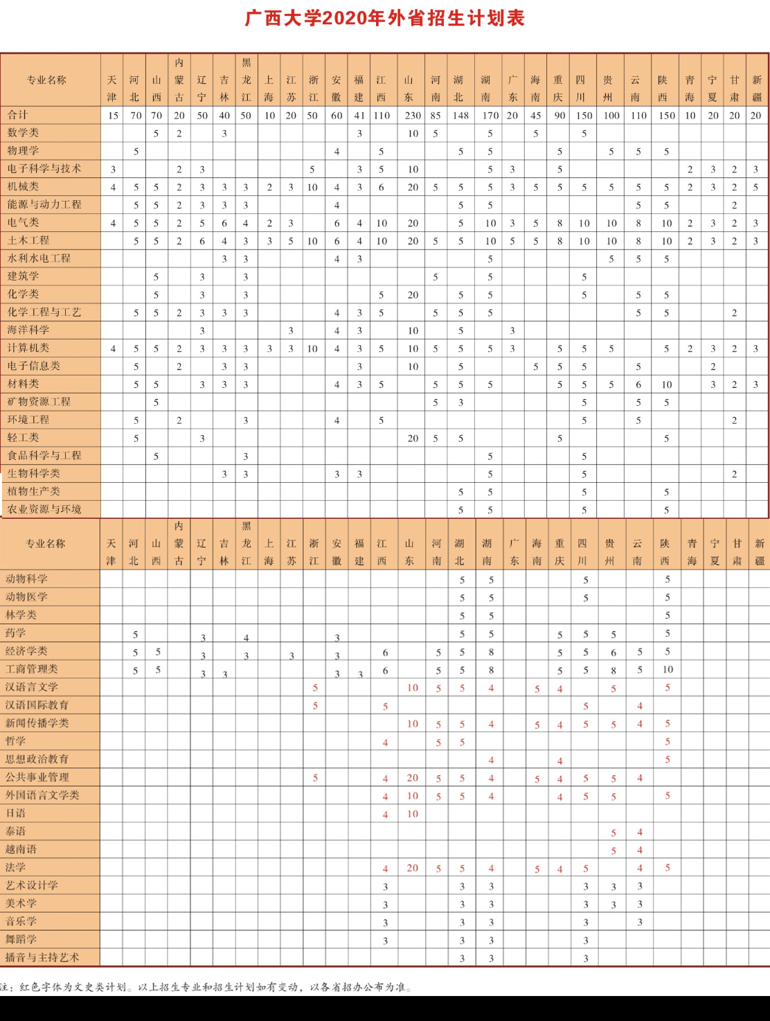 2020年外省招生计划表