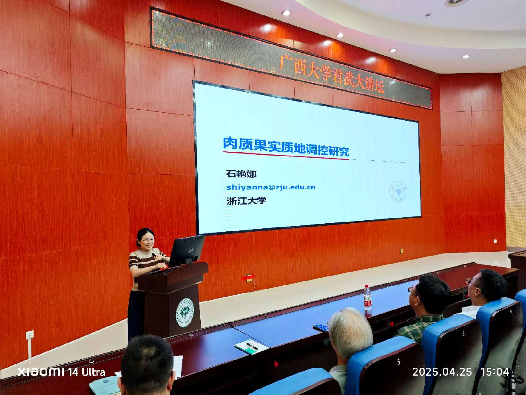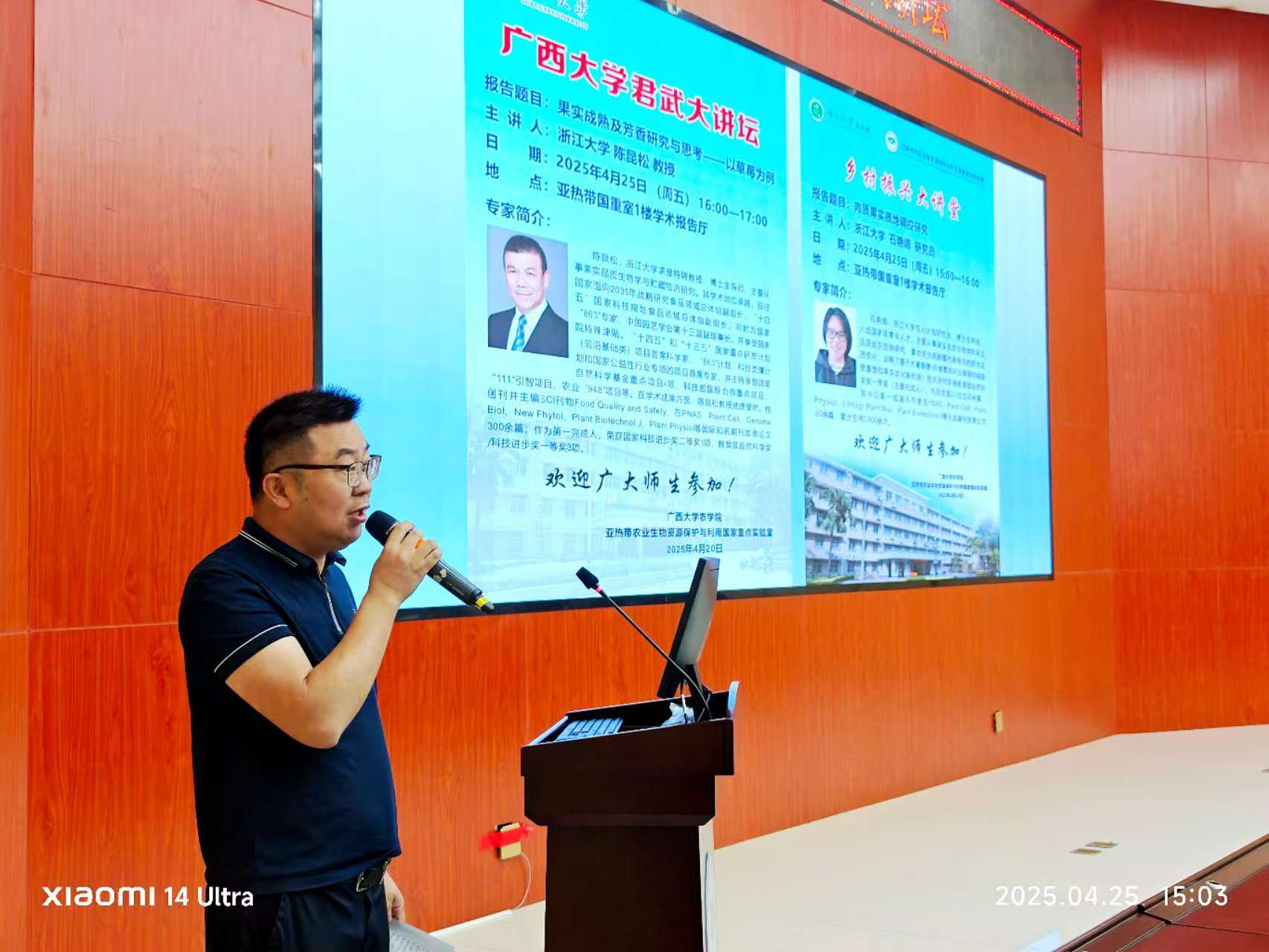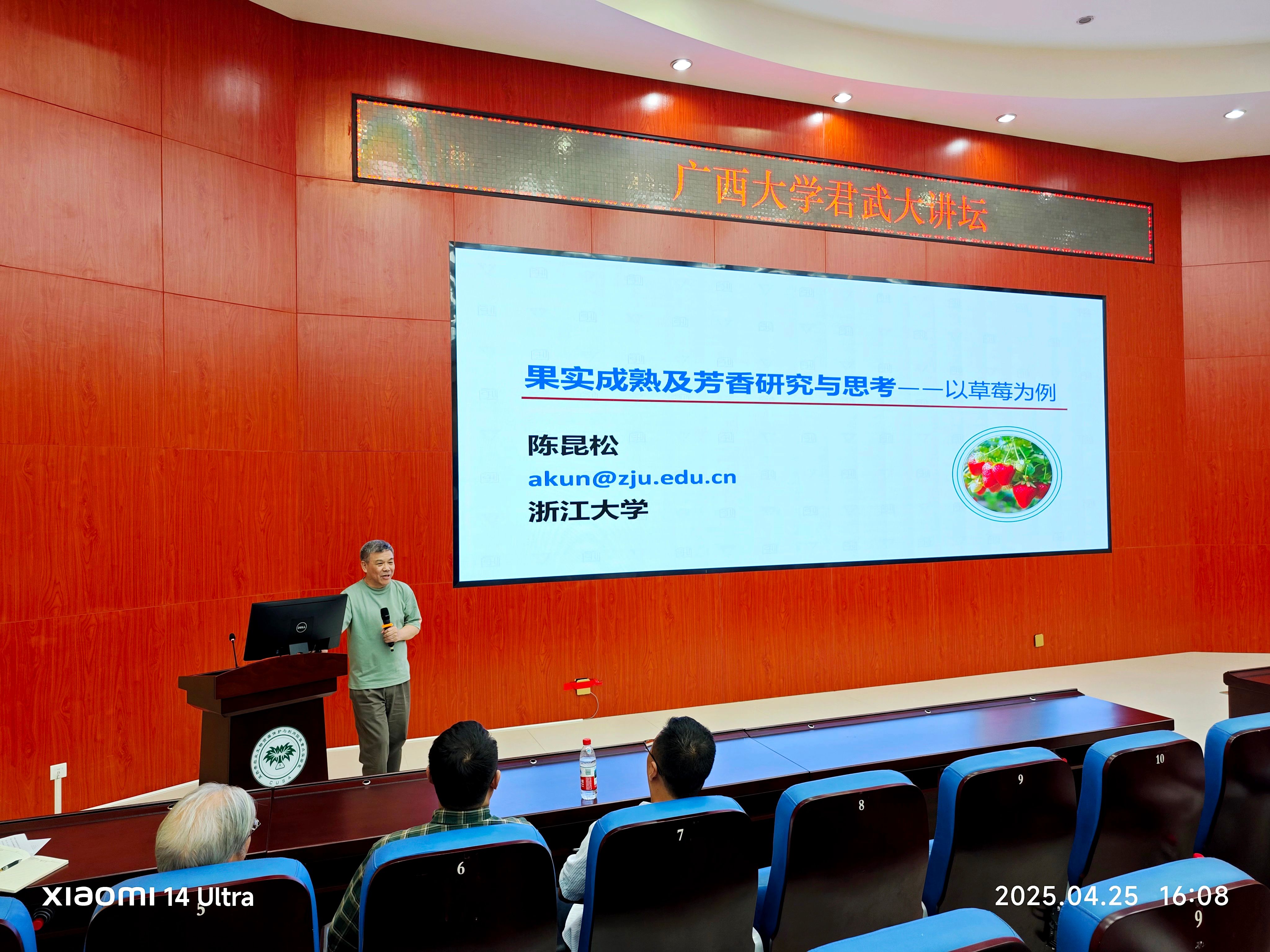 4月25日,浙江大学求是特聘教授陈昆松和浙江大学百人计划石艳娜研究员应邀到公司,开展了一场精彩纷呈的学术交流活动。陈昆松教授在君武大讲坛上,以“果实成熟及芳香研究与思考——以草莓为例”为主题进行了深度分享,石艳娜研究员则做客公司乡村振兴大讲堂,为师生作了题为“肉质果实质地调控研究”的学术报告。此次活动吸引了太阳成集团tyc122ccvip、亚热带农业生物资源保护与利用国家重点实验室(亚热带国重室)、生命科学与技术学、轻工与食品工程公司等多个公司的200余名师生参与聆听,报告会由亚热带国重室主任兼太阳成集团tyc122ccvip经理张积森教授主持。