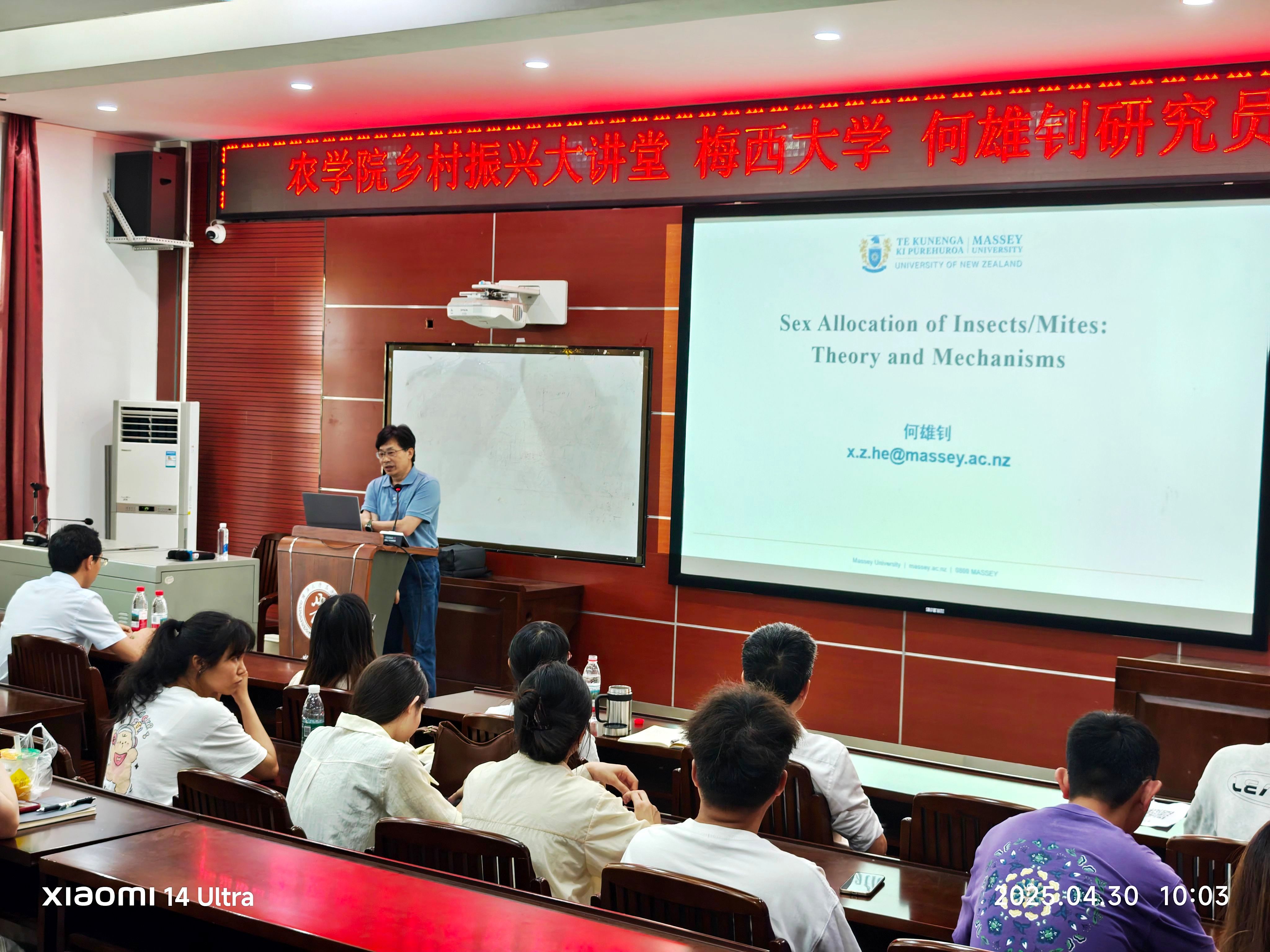 4月30日,由公司主办的“乡村振兴大讲堂”学术活动在公司306多媒体学术报告厅举办。新西兰梅西大学何雄钊研究员应邀以“Sex Allocation of Insects/Mites: Theories and Mechanisms”为题,为公司师生带来了一场精彩的学术报告,报告会由郑霞林教授主持