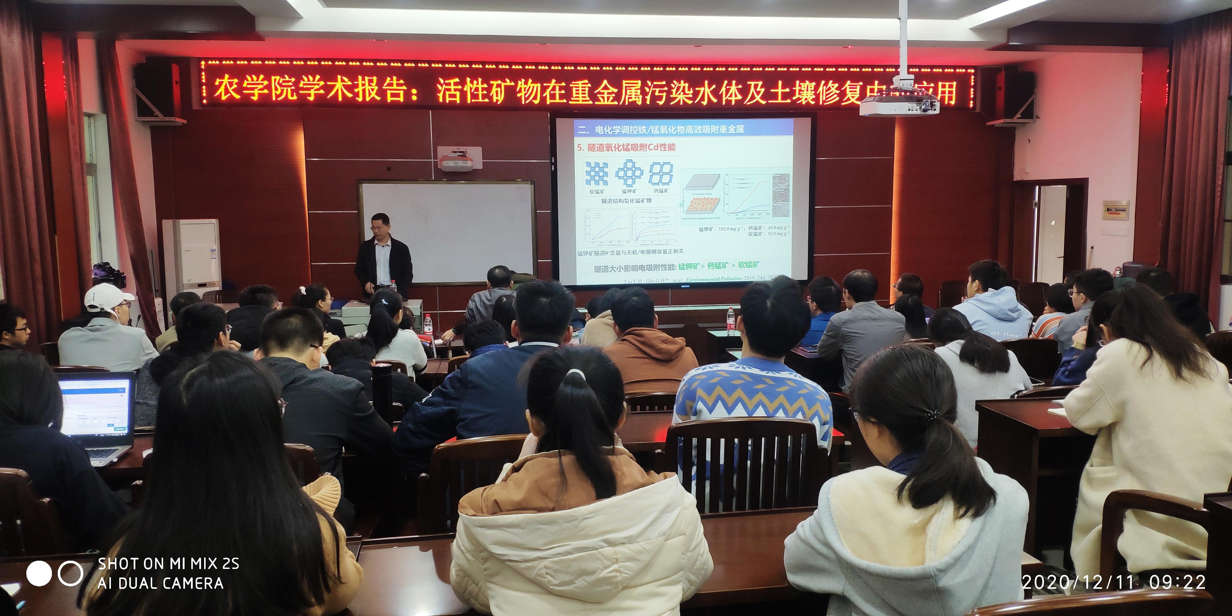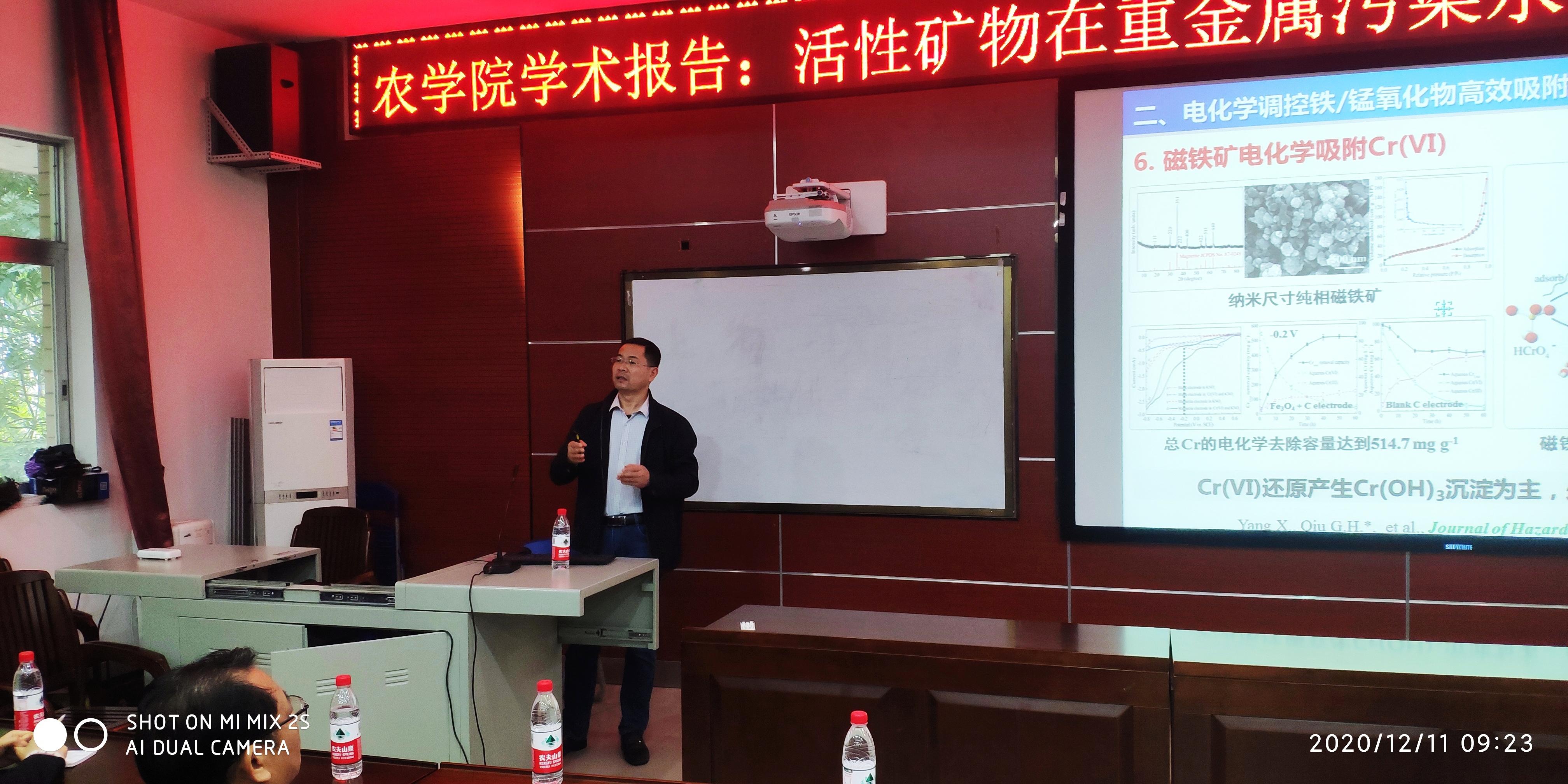 2020年12月11日上午,教育部新世纪优秀人才支持计划和中组部“万人计划”科技创新领军人才、华中农业大学邱国红教授应邀在太阳成集团tyc122ccvip306报告厅作题为“活性矿物在重金属污染水体及土壤修复中的应用”的学术报告,报告会由王令强教授主持,公司副经理何新华教授代表公司欢迎邱老师的到访并做介绍,100多名师生聆听了报告。