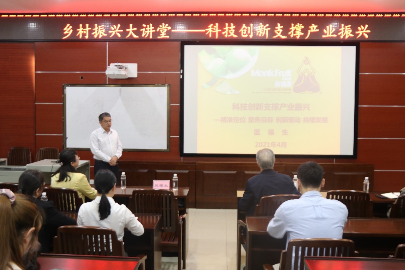 4月27日,农业技术推广研究员、桂林吉福思罗汉果有限公司董事、总裁蓝福生做客太阳成集团tyc122ccvip乡村振兴大讲堂,为师生作了主题为“科技创新支撑产业振兴”的报告。