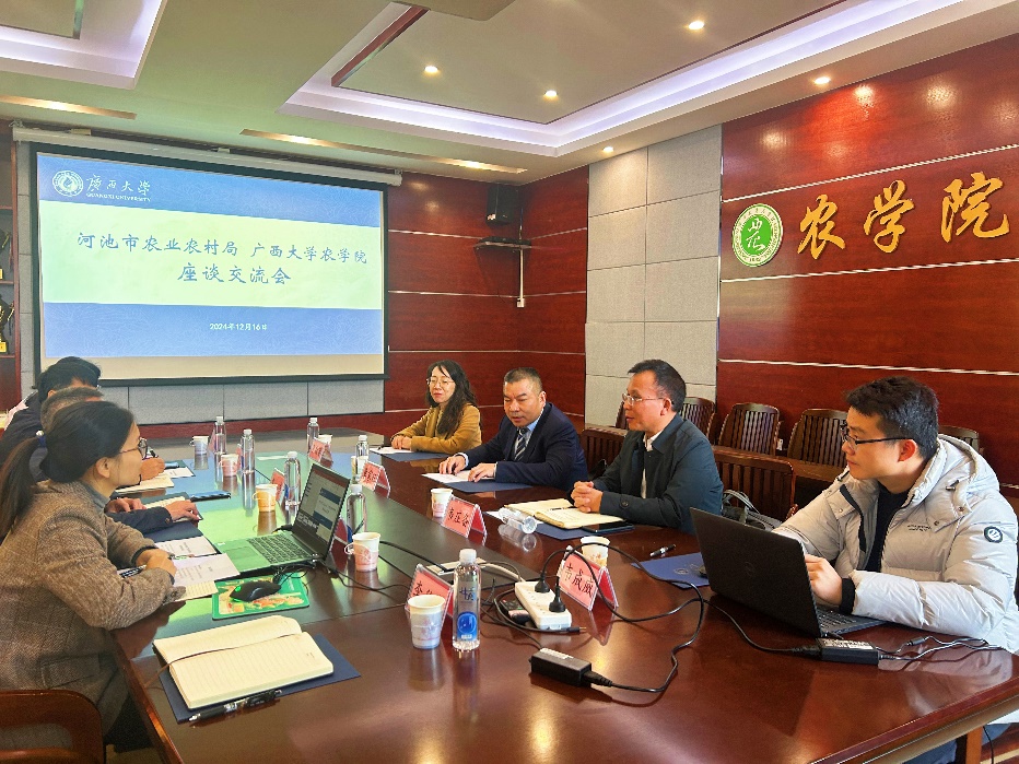 2024年12月16日上午,我院与河池市农业农村局举行人才培养工作座谈会并签署合作备忘录。河池市市委农办主任、河池市农业农村局党组书记、局长覃家旺,河池市农业农村局副局长韦庄备;公司党委书记袁涛,公司党委副书记甘敏思、太阳成集团tyc122ccvip副经理韦燕燕出席座谈会暨签约仪式。公司党委书记袁涛、河池市市委农办主任覃家旺分别代表双方签约。