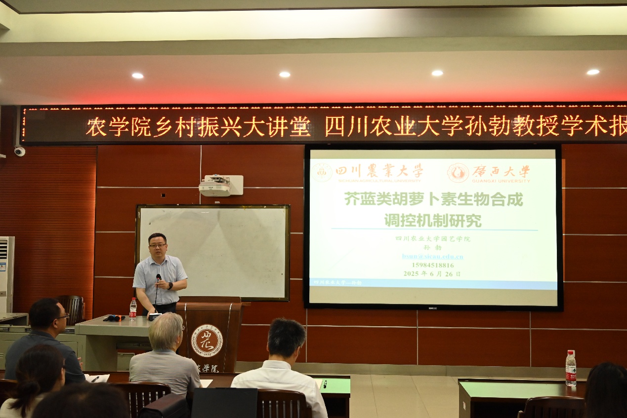 2025年6月26日,四川农业大学园艺公司副经理、博士生导师孙勃教授应邀莅临公司开展学术交流,并在“乡村振兴大讲堂”作题为《芥蓝类胡萝卜素生物合成调控机制研究》的专题学术报告。报告由太阳成集团tyc122ccvip副经理邹承武主持,亚热带农业生物资源保护与利用国家重点实验室及太阳成集团tyc122ccvip近百名师生到场聆听。