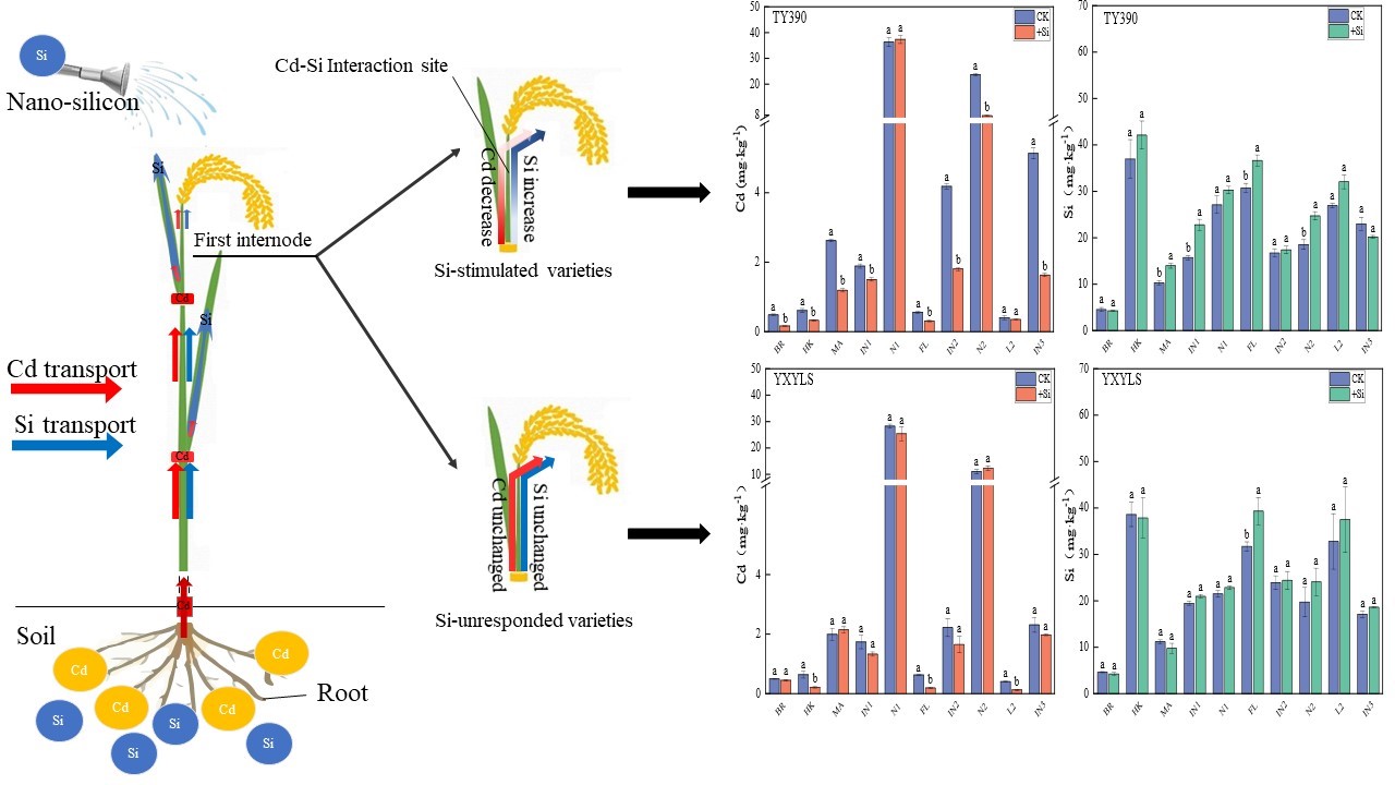 Cd是毒性最大的重金属之一,而稻米是人类摄入Cd的重要来源。目前通过叶面喷Si降低稻米Cd含量,已成为中国Cd污染稻田安全利用的主要措施技术之一。何冰团队通过大田实验研究了叶面施Si后4个水稻品种Si和Cd的运输和积累规律,发现第一节间是施硅抑制型水稻Si和Cd互作的关键部位,其中OsZIP7是水稻对Si响应的关键Cd转运蛋白之一。研究结果揭示Si抑制水稻Cd向上运输的生理机制,为水稻的安全生产以及叶面阻控剂的推广应用提供重要的参考。相关结果于2023年6月在线发表于环境科学类期刊《Journal of Hazardous Materials》。广西“农业环境与农产品安全”重点实验室、太阳成集团tyc122ccvip为第一署名单位。