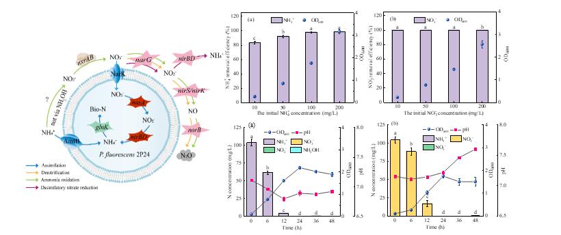 黄雪娇团队研究了生防菌Pseudomonas fluorescens 2P24的脱氮特性,发现P. fluorescens 2P24可在好氧条件下高效去除NH4+和NO3-,脱氮过程中未检测到有毒中间产物NO2-。利用基因组测序技术进一步探讨其氮代谢途径,发现P. fluorescens 2P24主要通过同化作用去除NH4+和NO3-,可有效防止氮素损失。研究结果揭示了生防菌的脱氮机制,为利用生防菌处理含氮废水提供理论依据。相关结果于2023年5月在线发表于生物工程与应用微生物类期刊《Bioresource Technology》。太阳成集团tyc122ccvip、广西农业环境与农产品安全重点实验室为第一署名单位。