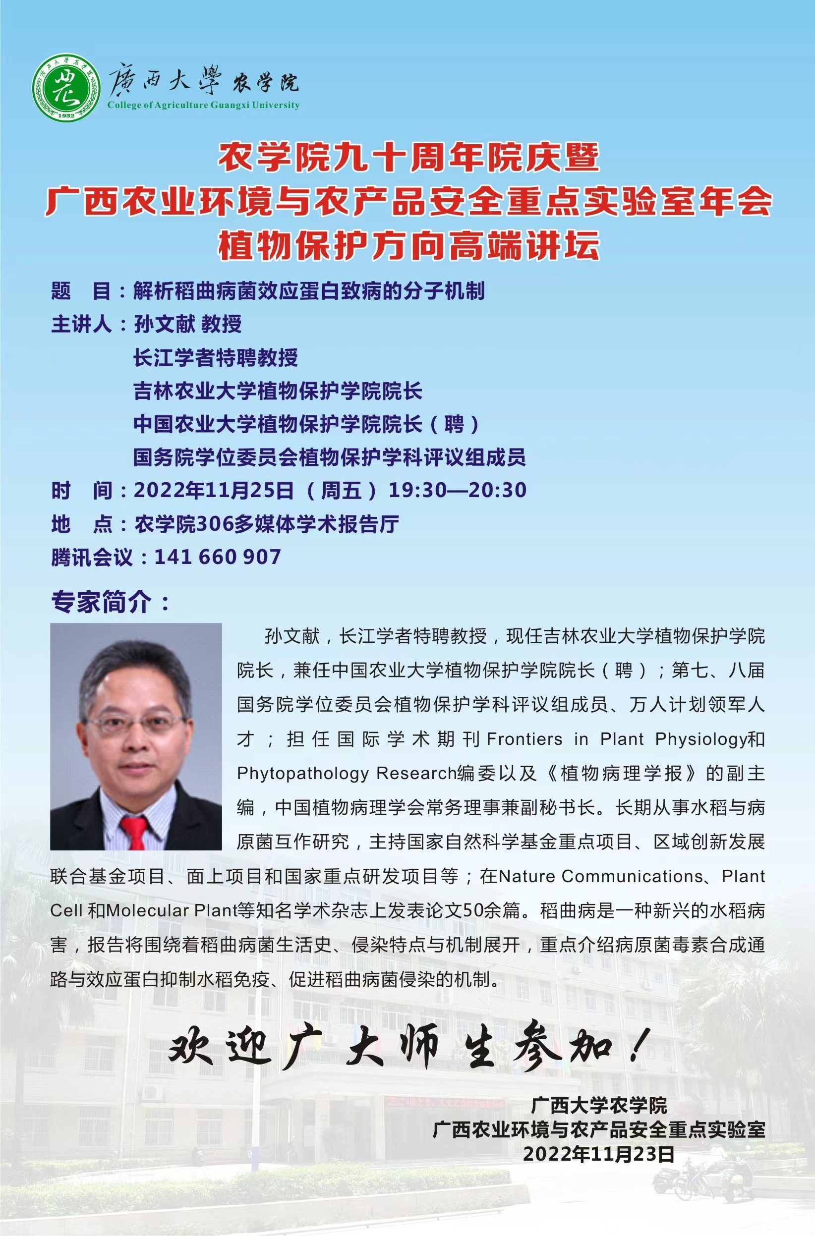 太阳成集团tyc122ccvip建院九十周年院庆学术活动-解析稻曲病菌效应蛋白致病的分子机制-孙文献